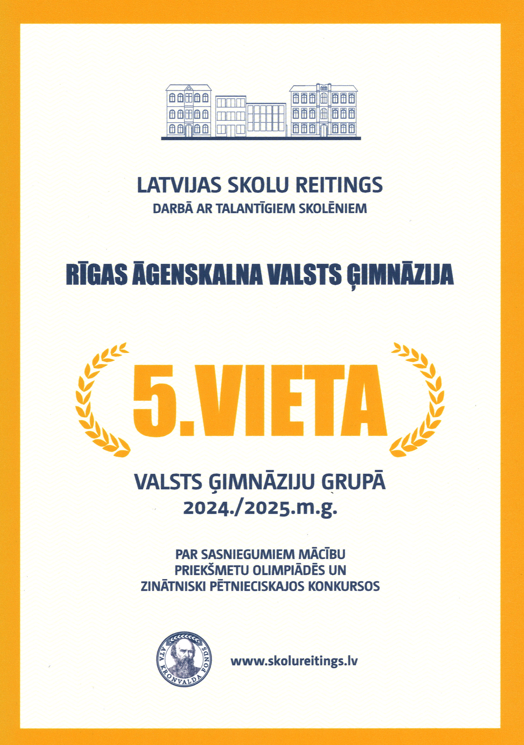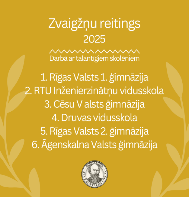 Ata Kronvalda fonds ir apkopojis Latvijas skolu audzēkņu panākumus 2024./2025. mācību gadā rīkotajās valsts mācību priekšmetu olimpiādēs, valsts atklātajās olimpiādēs un skolēnu zinātniski pētniecisko darbu konferencēs. Rīgas Āgenskalna Valsts ģimnāzija ir saglabājusi vietu labāko pieciniekā: