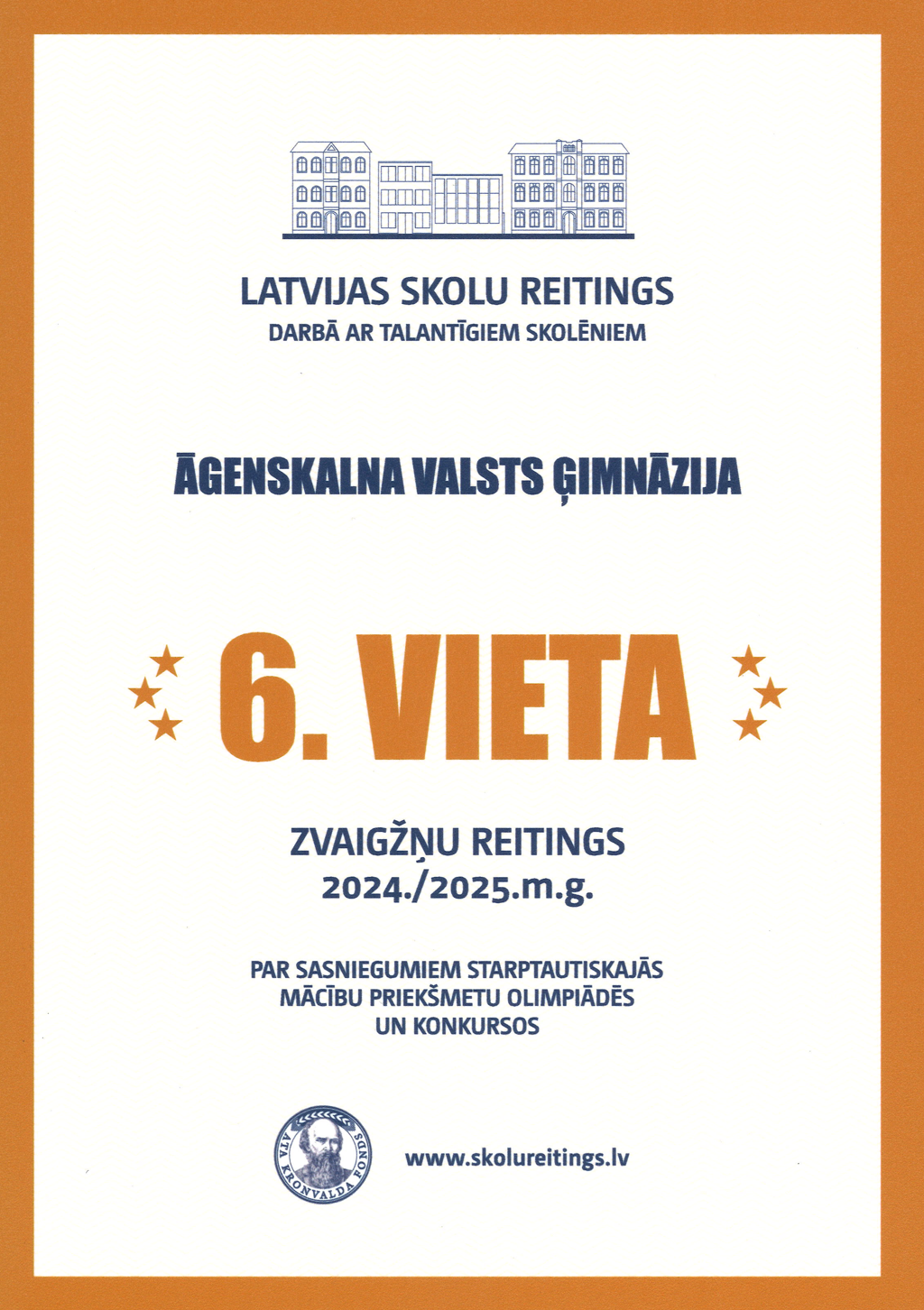 Noskaidrotas arī tās Latvijas skolas, kuru audzēkņiem ir ievērojami un augsti panākumi starptautiskās olimpiādēs 2024./2025. mācību gadā. Rīgas Āgenskalna Valsts ģimnāzija ieguvusi vietu olimpiskajā sešiniekā: