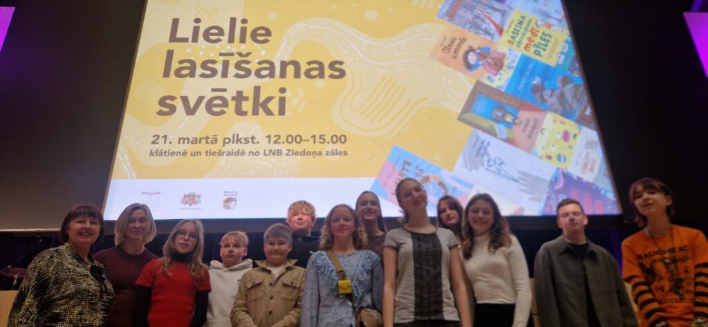 Sestdien, 21. martā, Latvijas Nacionālās bibliotēkas Ziedoņa zālē notika Lielie Lasīšanas svētki, kas ir ikgadējs Bērnu, jauniešu un vecāku žūrijas (BJVŽ) noslēguma pasākums un kuru apmeklēja arī mūsu skolas grāmatu eksperti, kuriem šis pasākums sagādāja gandarījumu un prieku, jo bija iespēja redzēt, dzirdēt un satikt BJVŽ 2025 apbalvoto un lasīto grāmatu autorus, tulkotājus, ilustratorus un izdevējus. Šo svētku pasākumu vadīja M. Grigalis, iesaistot aktivitātēs zālē esošos bērnus un jauniešus, kas radīja burvīgu un nepiespiestu gaisotni zālē un īstu svētku sajūtu. Balva pasākuma apmeklētājiem bija arī tas, ka vestibilā un citur LNB notika Rīgas Grāmatu svētki, kuru radītās iespējas izmantoja arī mūsu jaunieši gan iegādājoties grāmatas, gan piedaloties foto stūrītī, gan arī grāmatzīmju veidošanas meistarklasē.