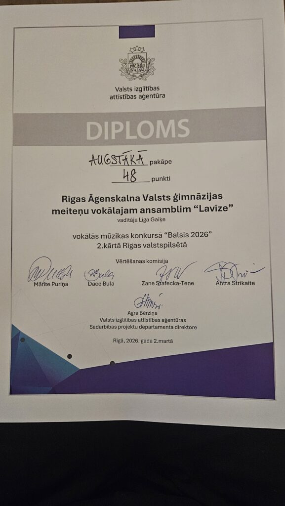RĀVĢ meiteņu ansamblis “Lavīze” izcili uzstājās vokālās mūzikas konkursa “Balsis 2026” 2.kārtā. Konkursa žūrija meitenēm piešķīra augstākās pakāpes diplomu. “Lavīze” kopā ar citiem labākajiem Rīgas dziedošajiem kolektīviem uzstāsies vokālo ansambļu dziedāšanas svētkos “Sadziedam” . Koncerts notiks š.g.5.maijā pl.18.00 Mazajā ģildē.