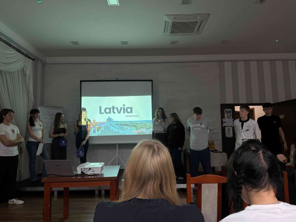 The next day we began talking about democracy (that was the theme of our project) – about how it originated. We created a “time machine” from Ancient Rome to the modern democratic system, and we also developed games that we presented to Polish students on Friday. Each of us used imagination while working together with new group members from other countries. At the end of the evening, the Latvian cultural night took place, during which we introduced young people to Latvia, our nation, traditions, values, and the things we are proud of. Later we energetically danced to the songs “Cūkas driķos” and “Genoveva”, and we also prepared a tasting table with traditional Latvian foods.