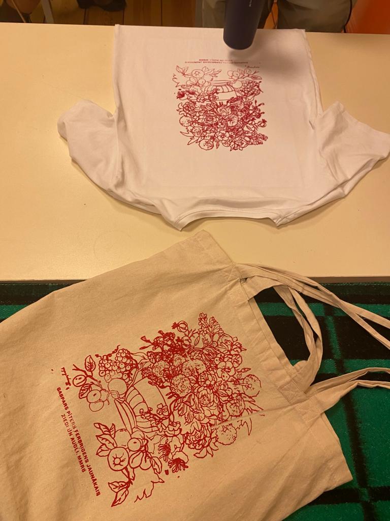 Kad mūs sagaidīja gides, klase tika sadalīta divās daļās. Pirmā grupa savu ceļojumu sāka ar sietspiedes tehnikas darbnīcu. Mūsu darbnīcas vadītāja no sākuma iepazīstināja ar šīs tehnikas vēsturi un specifiku. Uzzinājām, ka šī interesantā tehnika radusies Ķīnā un ir vairāk kā divas tūkstošgades veca. Vēl mūsdienās strādāt ar sietspiedi nozīmē lielu roku un komandas darbu. Rāmis, kurā ievietots polimēra tīkls ar izvēlēto dizainu, visbiežāk ir jāpalīdz turēt kādam citam. Visa tehnikas maģija slēpjas pareizi izvēlētās auduma, krāsas un tās biezuma, pielietotā spēka kombinācijās. Jāuzsaka arī pieejamie dizaini, kas variēja no G. P. Febrirgena jaunākā “Ziediem un augļiem” līdz pat Rīgas Biržas ikonai- Dmitrija Gutova darbam “Gondola”. Ikvienam tika sniegta iespēja izmēģināt šo unikālo tehniku, pēc kuras mūsu krekliņus un auduma maisiņus rotāja raibi Rīgas Biržas atpazīstamākie mākslas darbi. Pavisam noteikti var apgalvot, ka visi darbiņi ir izdevušies izcili, neatkarīgi no tā, vai šo tehniku izmēģināja pirmo vai otro reizi. Visā darba veikšanas laikā gaisā virmoja patīkama satraukuma, miera un izpalīdzības gaisotne. Darba vadītājas bija profesionālas un jaukas, kā arī paveiktā darba rezultāti ir izcili.